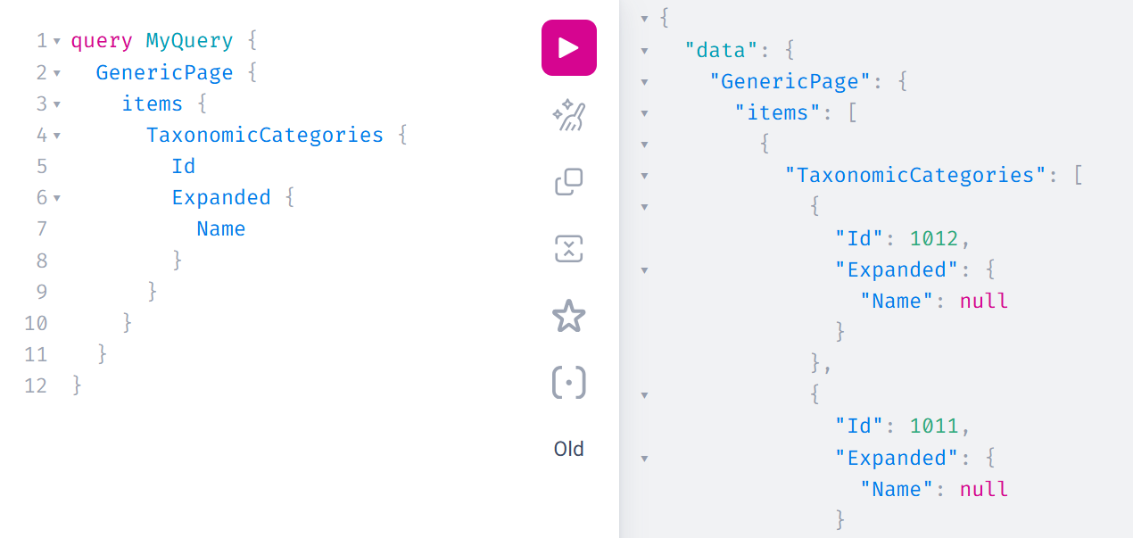 }Having that, it is possible to create specific properties. For example, there might be a special interface, IHasTaxonomicCategories, that marks the content and forces it to contain necessary category properties. Then the custom property can be registered for interface implementations that add a new graph field - TaxonomicCategoriesExpanded, where all necessary data, like names and descriptions, can be found.